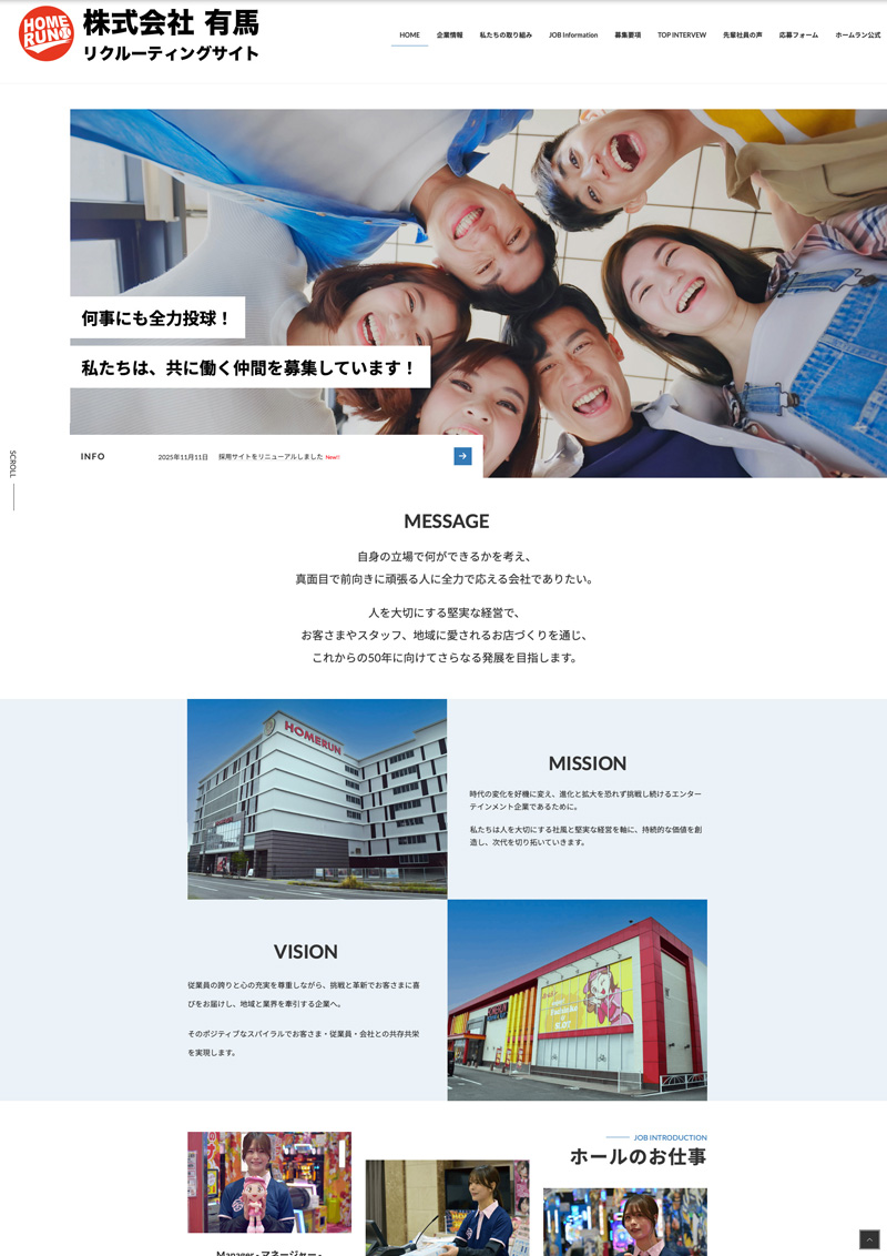 株式会社有馬様(パーラーホームラン)オフィシャルサイトおよび採用サイトをリニューアルいたしました。